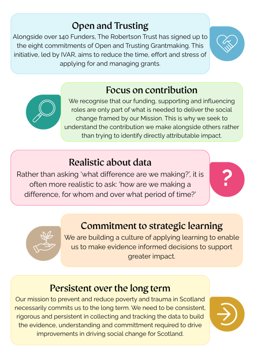 We aim to recognise and manage the balance between seeking assurance about impact and adapting in the face of uncertainty in pursuit of social change. We have developed our IIF to sharpen the line of sight between the change we want to see in Scotland and the contribution we make with our partners. Through the development of a comprehensive and rigorous framework, we are building on the approaches we have tested so far to gather and make sense of meaningful data, drive a strategic learning cycle, and apply evidence and insights to improve our practice and strategic decision-making.